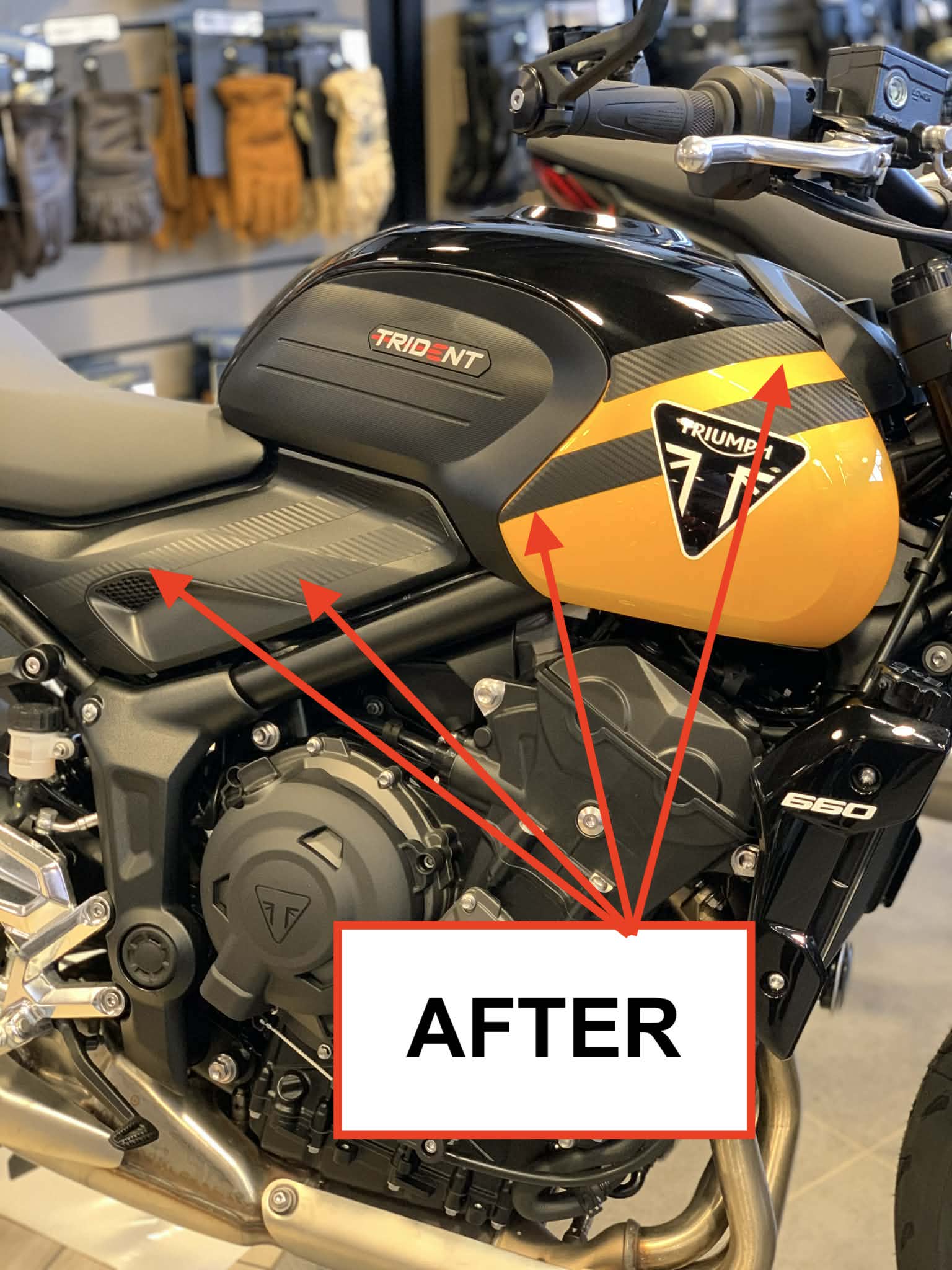 Kit stickers pour la moto de la marque TRIUMPH, modèle TRIDENT 660 de l'année 2025 uniquement : peu importe la couleur de votre TRIDENT 2025, nous vous proposons de recouvrir les bandes blanches (à droite et à gauche ! )